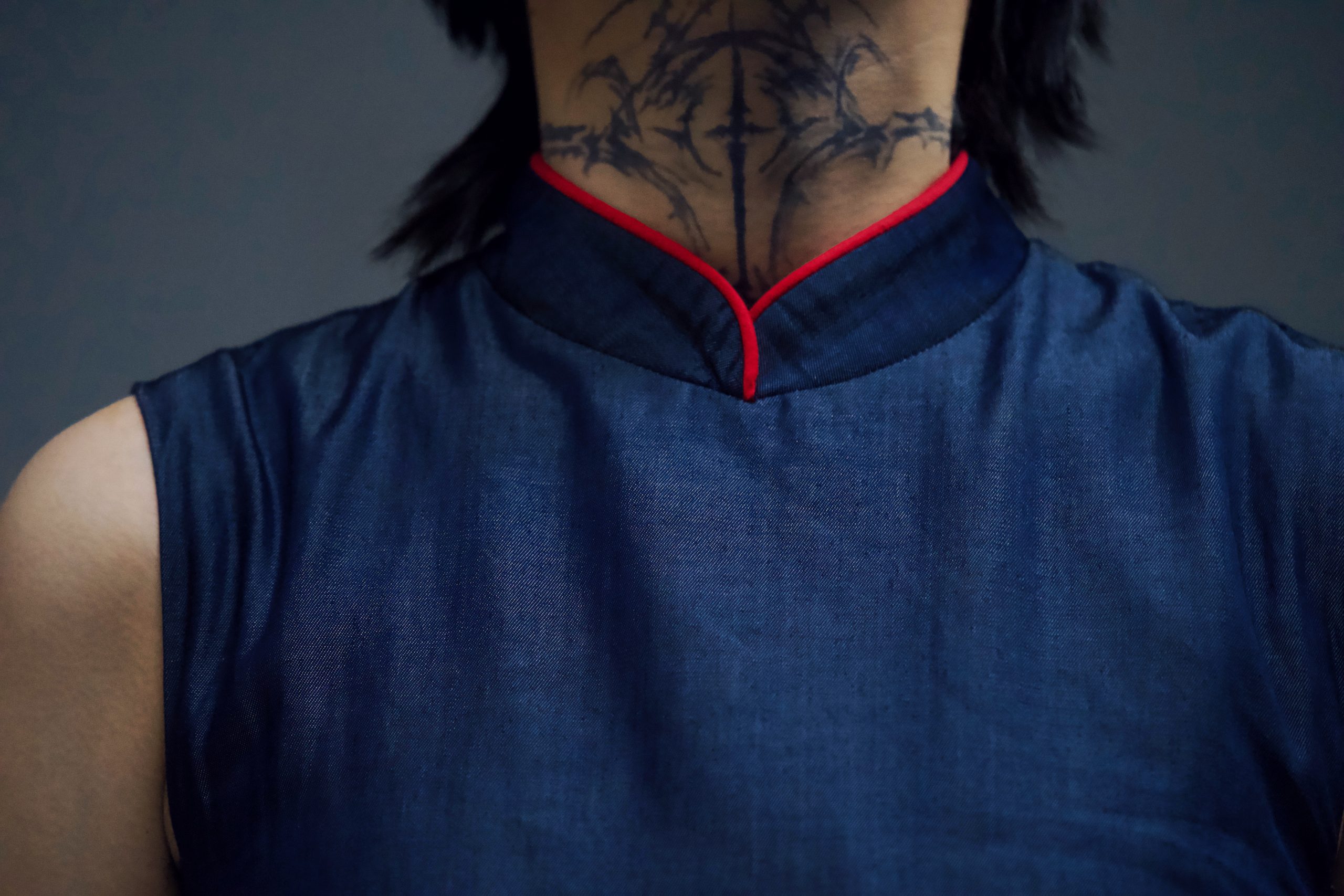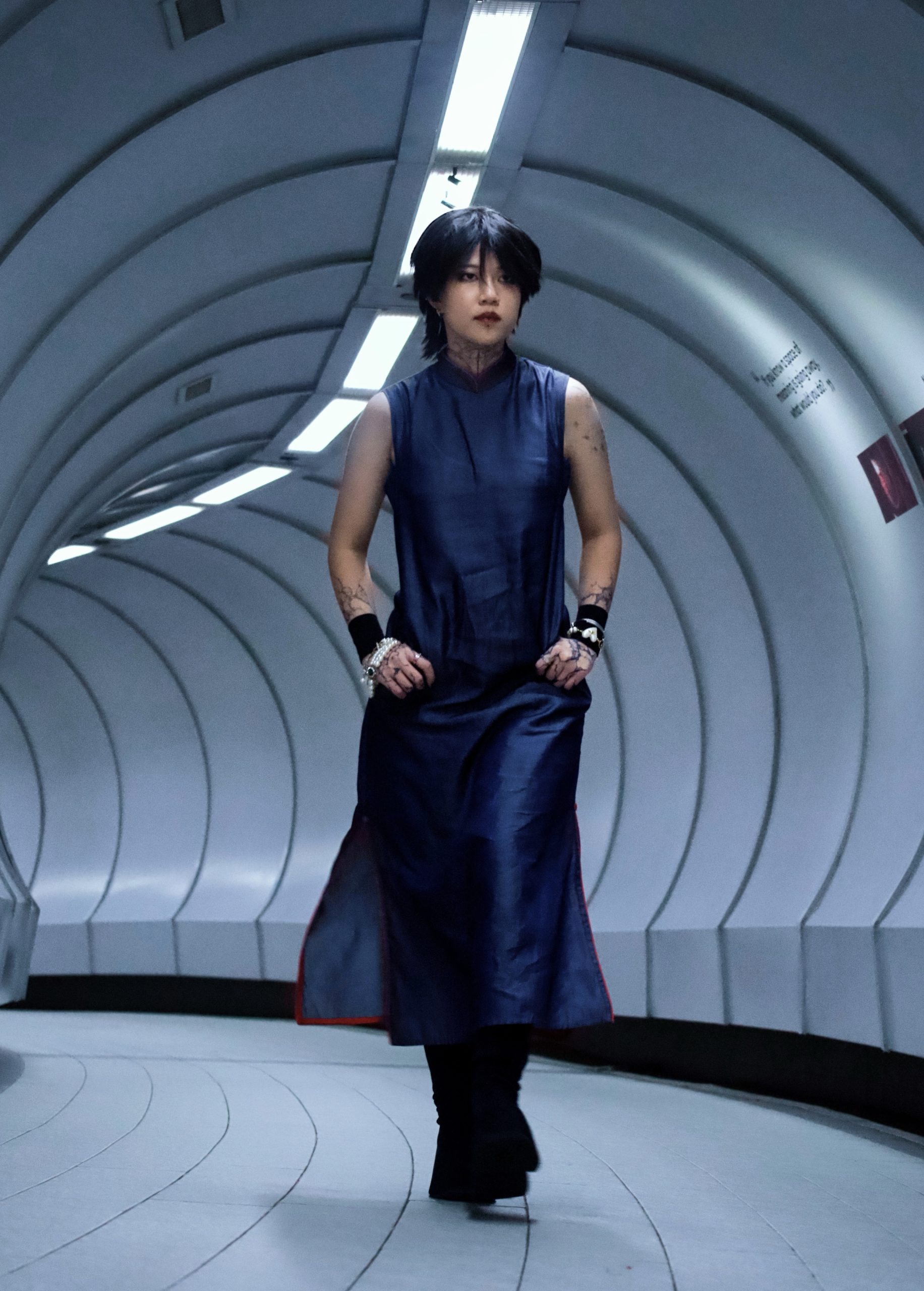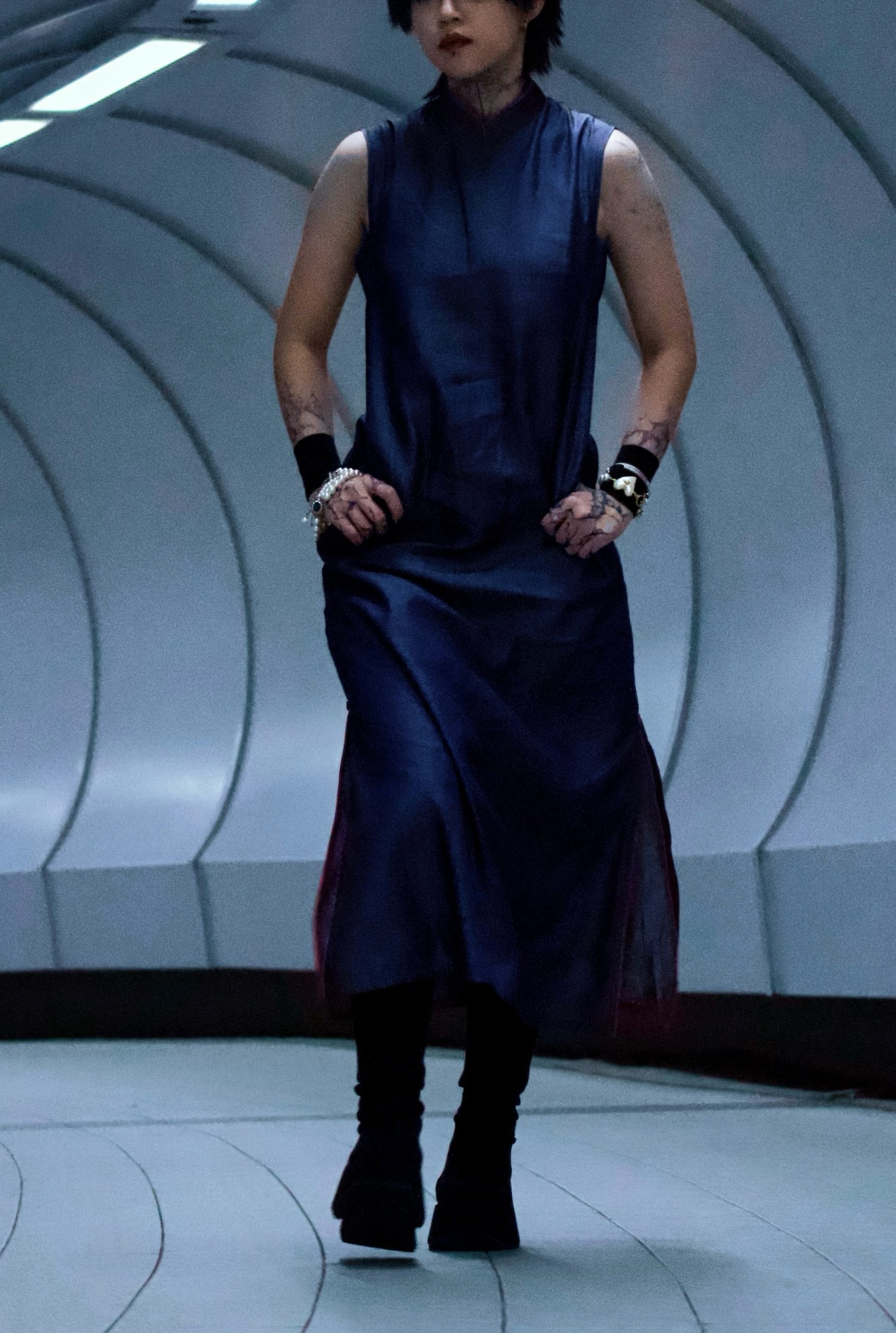 Its deep navy hue evokes the mystery and elegance of the night sky, while the long, sleeveless design blends traditional elements with a bold, modern edge. The high mandarin collar and subtle tailoring suggest a nod to cultural heritage, while the dramatic side slits, revealed with hints of contrasting red, add a sense of movement and intrigue. Perfect for a commanding presence, the Midnight Stride Gown exudes strength, sophistication, and individuality, ideal for those who seek to make a statement with grace and confidence.